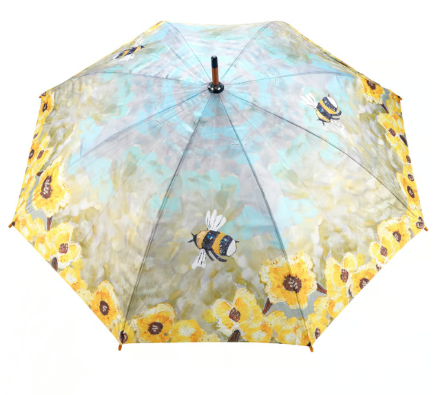 A stylish umbrella displaying a full color design of bumblebees buzzing over yellow flowers on the canopy. Bumblebee design is replicated from original art created at the Friendship Heart Gallery in downtown Lancaster, PA that supports artists with intellectual disabilities and autism.