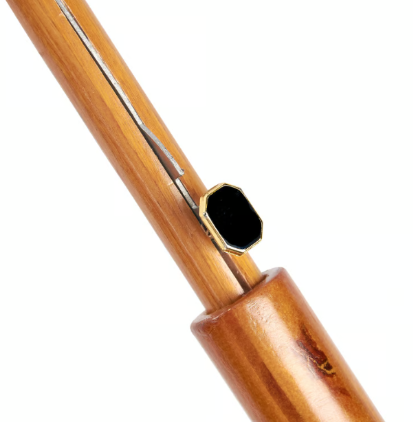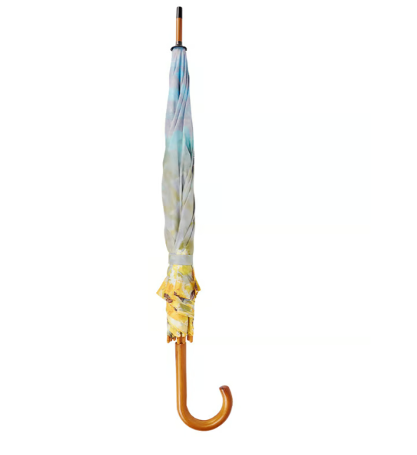 Artful umbrella is a classic design featuring a durable curved wooden handle with easy to open canopy and push button to collapse and tie shut with coordinating strap.